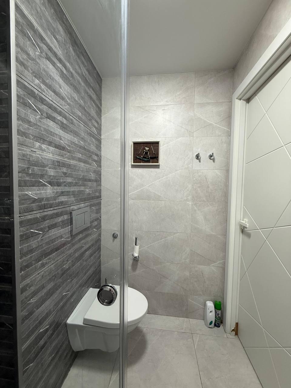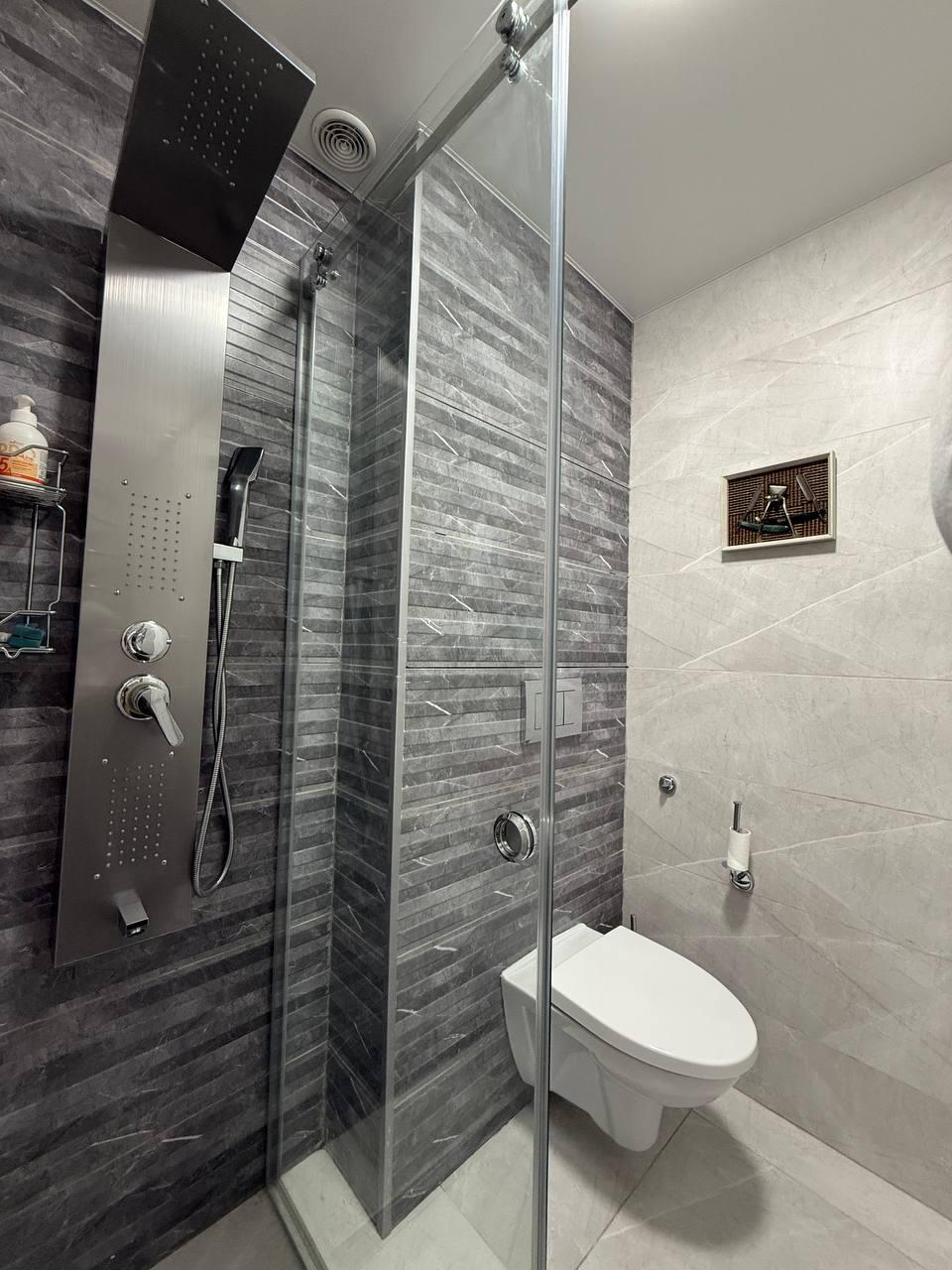 Ванная комната в плитке, всё аккуратно и ухоженно.